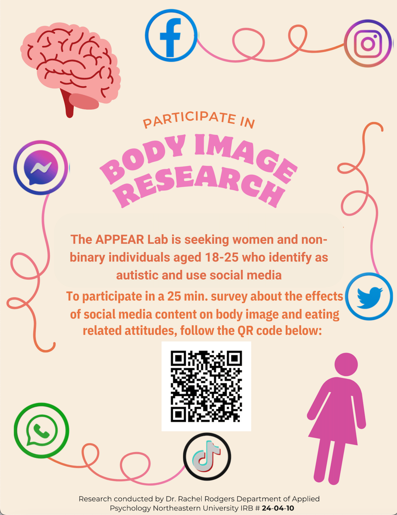 The APPEAR Lab is seeking women and non-binary individuals aged 18-25 who identify as autistic and use social media to participate in a 25 minute survey about the effects of social media content on body image and eating related attitudes.